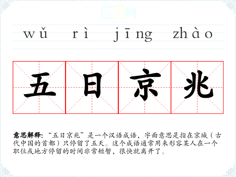 “五日京兆”是一个汉语成语,字面意思是指在京城(古代**的首都)只停留了五天。这个成语通常用来形容某人在一个职位或地方停留的时间非常短暂,很快就离开了。