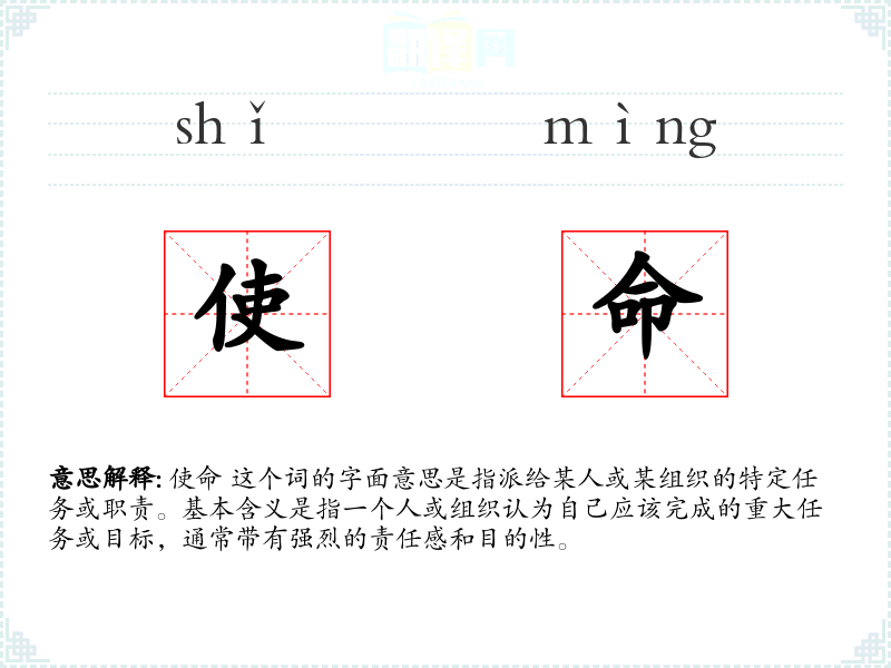 使命 这个词的字面意思是指派给某人或某组织的特定任务或职责。基本含义是指一个人或组织认为自己应该完成的重大任务或目标,通常带有强烈的责任感和目的性。