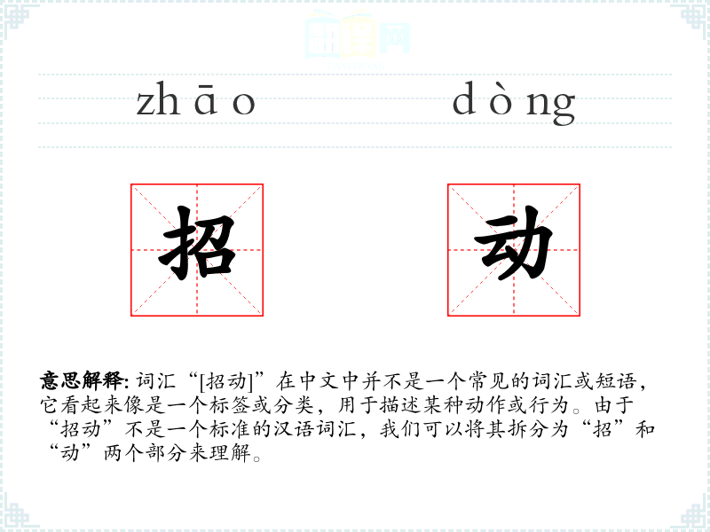“招动”虽然不是一个标准词汇,但通过对其组成部分的理解和分析,我们可以推测它在特定语境下的含义。在语言学*和表达中,理解词汇的多义性和灵活性是非常重要的。