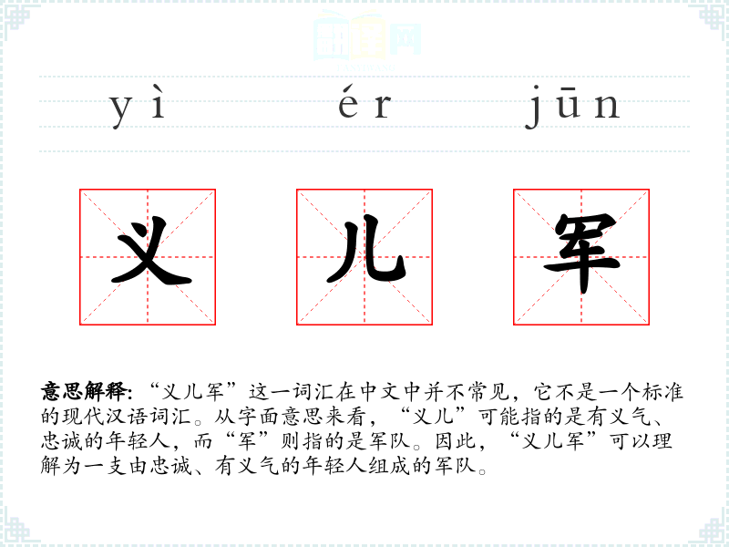 “义儿军”这一词汇在中文中并不常见,它不是一个标准的现代汉语词汇。从字面意思来看,“义儿”可能指的是有义气、忠诚的年轻人,而“军”则指的是军队。因此,“义儿军”可以理解为一支由忠诚、有义气的年轻人组成的军队。