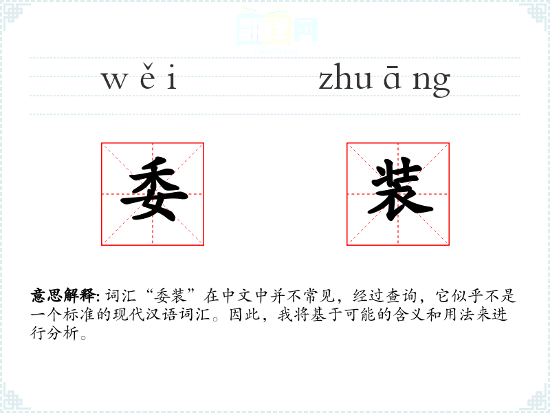 词汇“委装”在中文中并不常见,经过查询,它似乎不是一个标准的现代汉语词汇。因此,我将基于可能的含义和用法来进行分析。