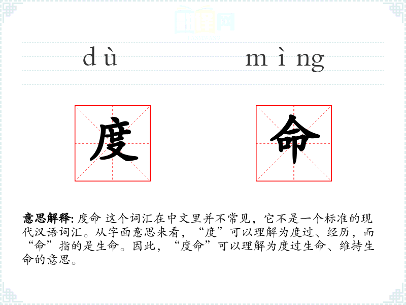 度命 这个词汇在中文里并不常见,它不是一个标准的现代汉语词汇。从字面意思来看,“度”可以理解为度过、经历,而“命”指的是生命。因此,“度命”可以理解为度过生命、维持生命的意思。