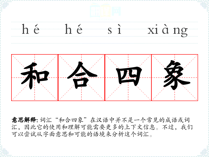 词汇“和合四象”在汉语中并不是一个常见的成语或词汇,因此它的使用和理解可能需要更多的上下文信息。不过,我们可以尝试从字面意思和可能的语境来分析这个词汇。