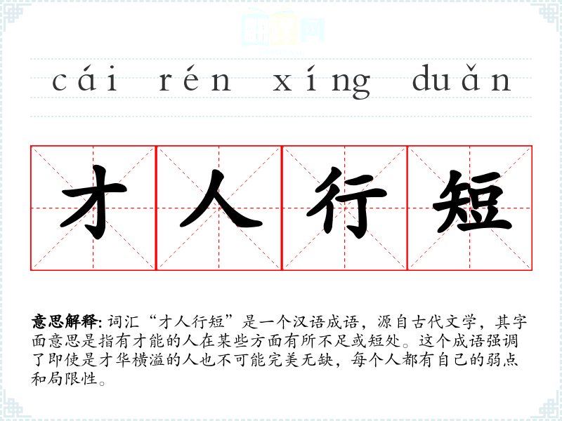 “才人行短”这个成语的字面意思是说,即使是有才能的人,也会有不足之处。它强调了人无完人的道理,提醒人们要客观看待他人的优点和缺点。