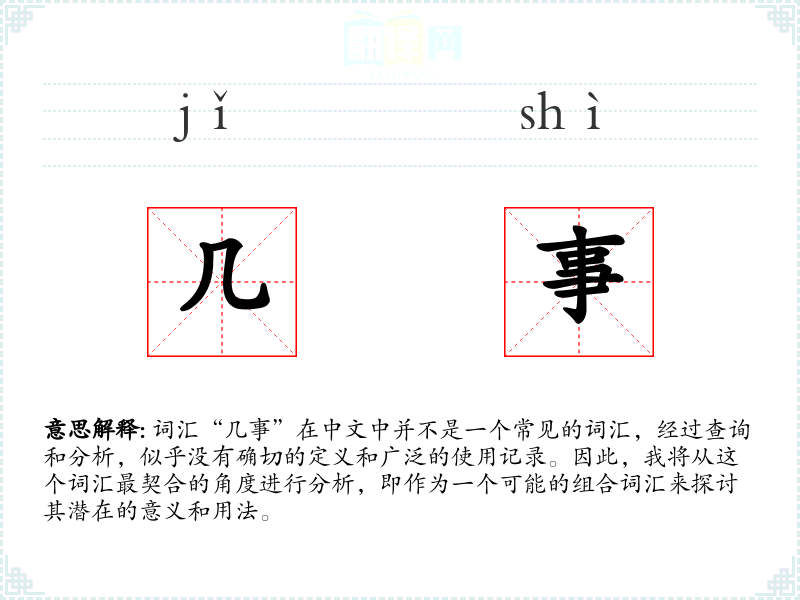 - 反义词:无(因为“几事”不是一个常用词汇,反义词不适用)