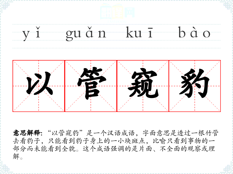 “以管窥豹”是一个汉语成语,字面意思是透过一根竹管去看豹子,只能看到豹子身上的一小块斑点,比喻只看到事物的一部分而未能看到全貌。这个成语强调的是片面、不全面的观察或理解。