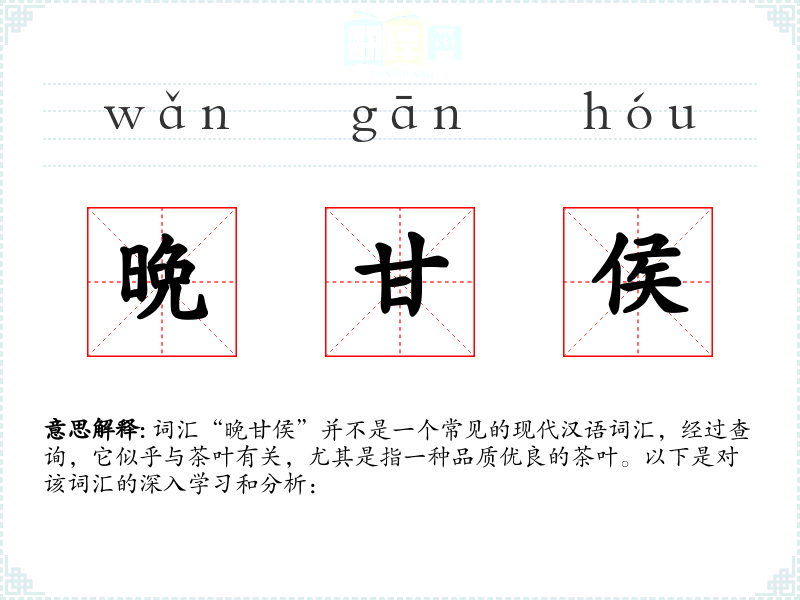 词汇“晚甘侯”并不是一个常见的现代汉语词汇,经过查询,它似乎与茶叶有关,尤其是指一种品质优良的茶叶。以下是对该词汇的深入学*和分析: