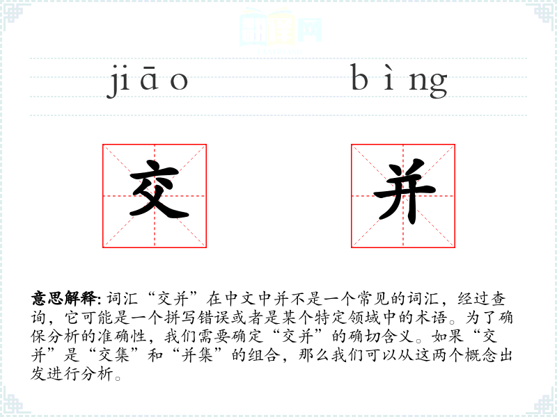 词汇“交并”在中文中并不是一个常见的词汇,经过查询,它可能是一个拼写错误或者是某个特定领域中的术语。为了确保分析的准确性,我们需要确定“交并”的确切含义。如果“交并”是“交集”和“并集”的组合,那么我们可以从这两个概念出发进行分析。