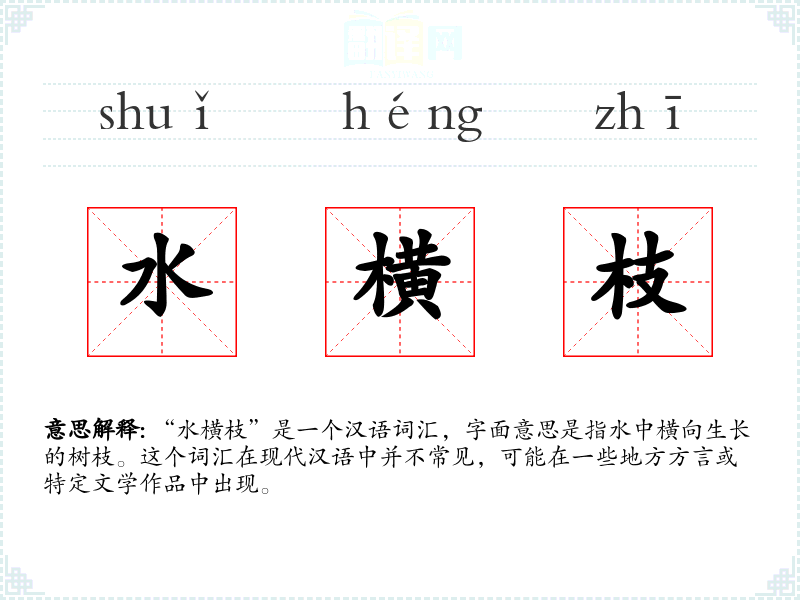 “水横枝”是一个汉语词汇,字面意思是指水中横向生长的树枝。这个词汇在现代汉语中并不常见,可能在一些地方方言或特定文学作品中出现。
