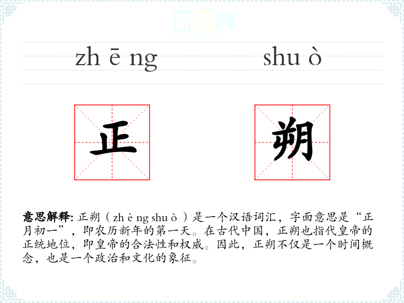 正朔(zhèng shuò)是一个汉语词汇,字面意思是“正月初一”,即农历新年的第一天。在古代,正朔也指代的正统地位,即**的合法性和权威。因此,正朔不仅是一个时间概念,也是一个政治和文化的象征。
