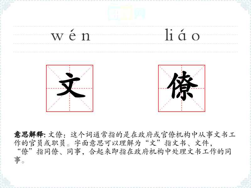 文僚:这个词通常指的是在政府或官僚机构中从事文书工作的官员或职员。字面意思可以理解为“文”指文书、文件,“僚”指同僚、同事,合起来即指在政府机构中处理文书工作的同事。