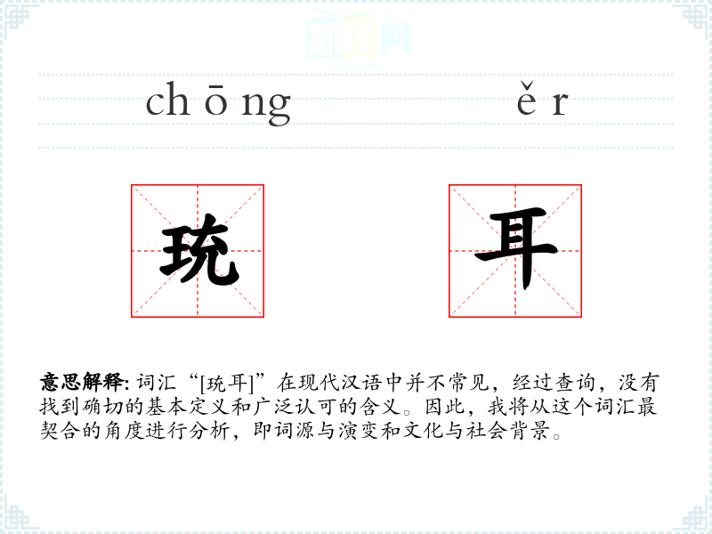 词汇“[珫耳]”在现代汉语中并不常见,经过查询,没有找到确切的基本定义和广泛认可的含义。因此,我将从这个词汇最契合的角度进行分析,即词源与演变和文化与社会背景。