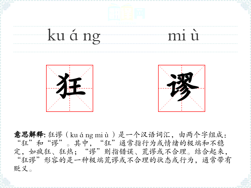 “狂”字最早见于《说文解字》,原意为狗发疯,后引申为人或事物的极端状态。“谬”字则源自《说文》,意为错误。两个字结合使用,形成“狂谬”一词,用以形容极端的错误或荒谬。