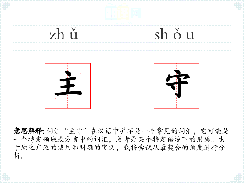 由于“主守”不是一个通用词汇,它在不同语境下的使用可能非常有限。如果它出现在某个特定的文学作品、口语对话或专业领域中,那么它的含义将取决于该语境的具体要求。