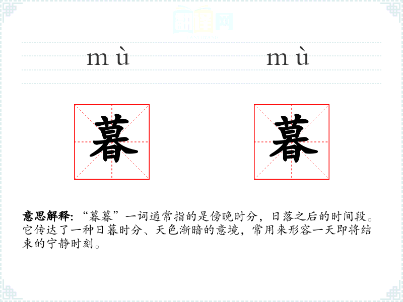 - 专业领域:在气象学或天文学中,可能会使用“暮暮”来指代日落后的特定时间段。