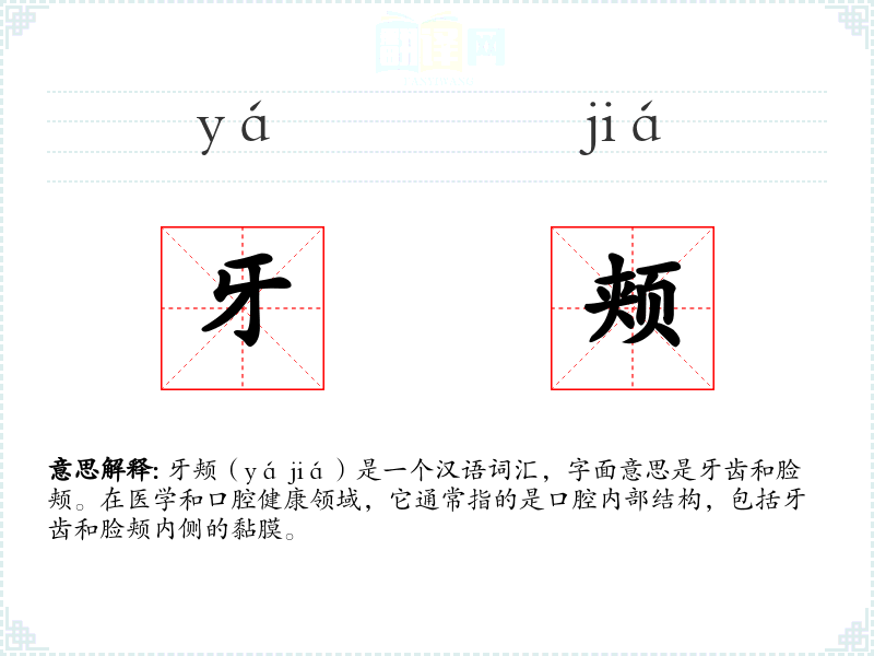 牙颊(yá jiá)是一个汉语词汇,字面意思是牙齿和脸颊。在医学和口腔健康领域,它通常指的是口腔内部结构,包括牙齿和脸颊内侧的黏膜。