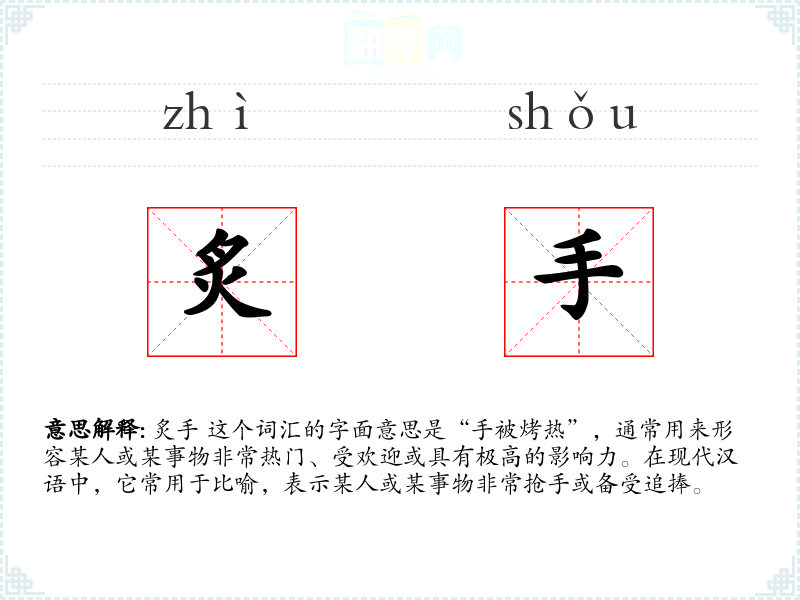 炙手 这个词汇的字面意思是“手被烤热”,通常用来形容某人或某事物非常热门、受欢迎或具有极高的影响力。在现代汉语中,它常用于比喻,表示某人或某事物非常抢手或备受追捧。