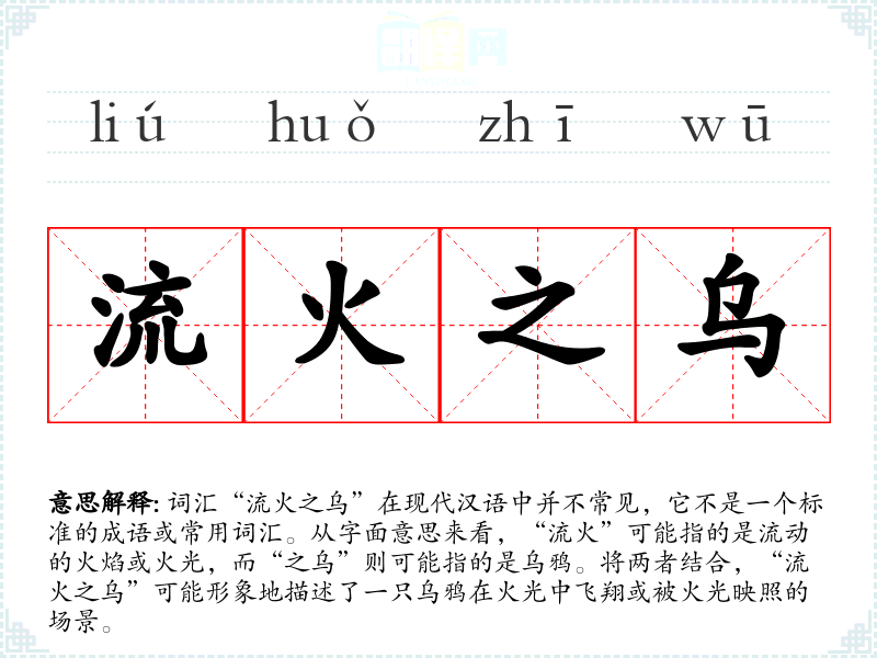- 由于“流火之乌”不是一个常用词汇,其词源和演变不太明确。可能源自古代文学作品或民间传说。