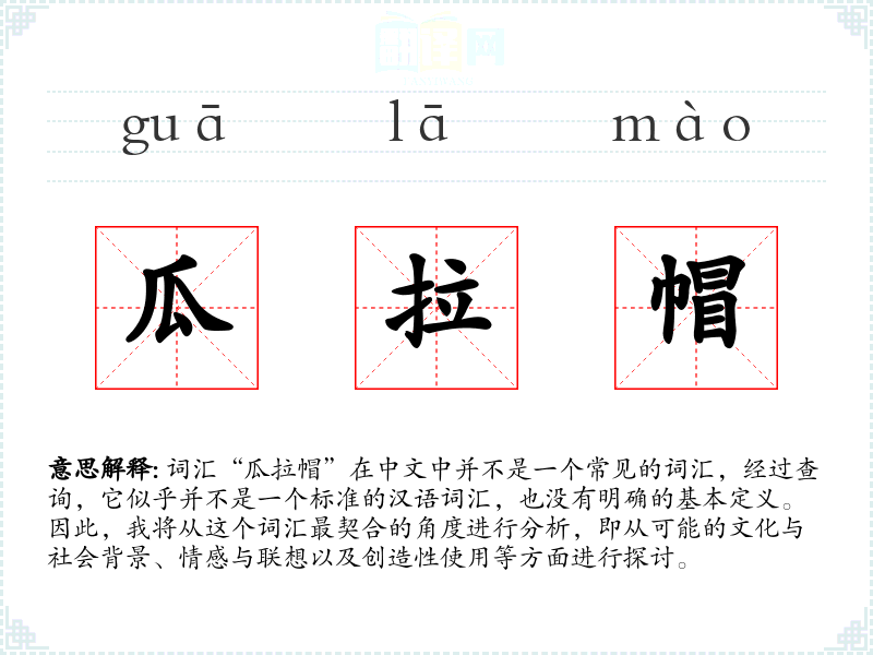 由于“瓜拉帽”不是一个标准的汉语词汇,我们无法给出一个确切的基本定义。它可能是某个地区方言中的词汇,或者是某个特定社群中的俚语。