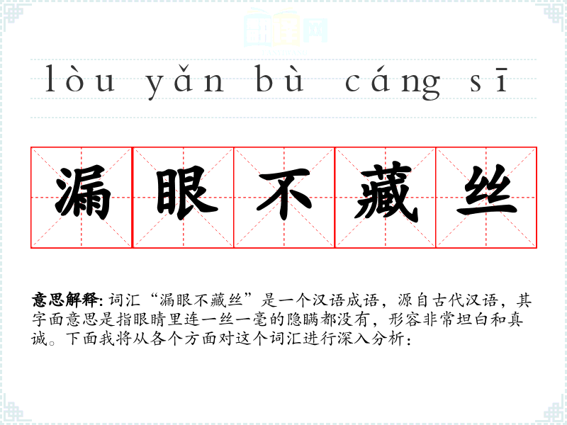 词汇“漏眼不藏丝”是一个汉语成语,源自古代汉语,其字面意思是指眼睛里连一丝一毫的隐瞒都没有,形容非常坦白和真诚。下面我将从各个方面对这个词汇进行深入分析: