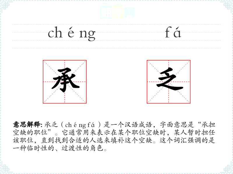 承乏(chéng fá)是一个汉语成语,字面意思是“承担空缺的职位”。它通常用来表示在某个职位空缺时,某人暂时担任该职位,直到找到合适的人选来填补这个空缺。这个词汇强调的是一种临时性的、过渡性的角色。