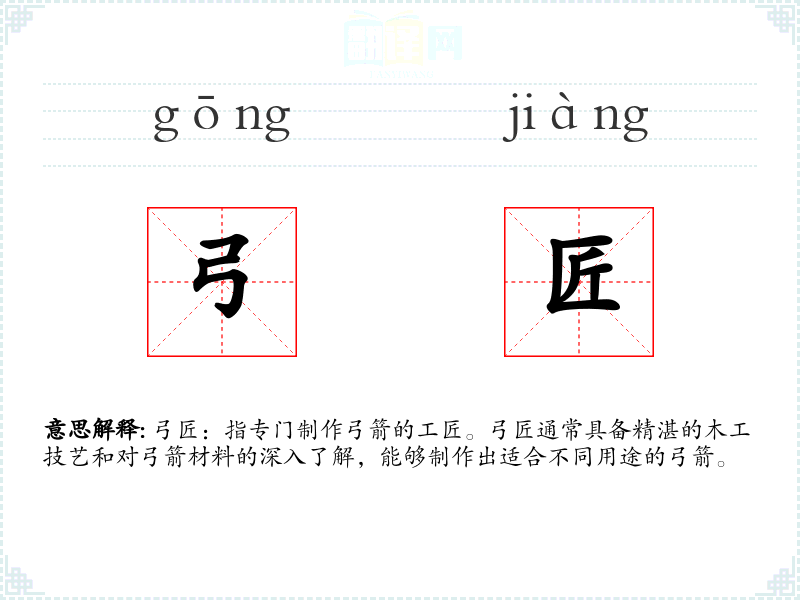 - 反义词:无特定反义词,但可以与“使用者”相对,如“弓箭手”与“弓匠”相对。