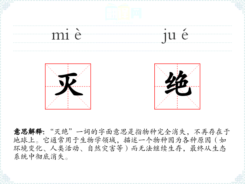 “灭绝”一词的字面意思是指物种完全消失,不再存在于地球上。它通常用于生物学领域,描述一个物种因为各种原因(如环境变化、人类活动、自然灾害等)而无法继续生存,最终从生态系统中彻底消失。