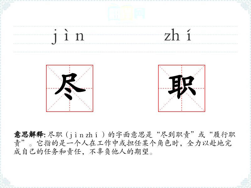 尽职(jìn zhí)的字面意思是“尽到职责”或“履行职责”。它指的是一个人在工作中或担任某个角色时,全力以赴地完成自己的任务和责任,不辜负他人的期望。