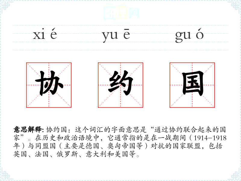 协约国:这个词汇的字面意思是“通过协约联合起来的国家”。在历史和政治语境中,它通常指的是在一战期间(1914-1918年)与同盟国(主要是德国、奥匈帝国等)对抗的国家联盟,包括英国、法国、俄罗斯、意大利和美国等。