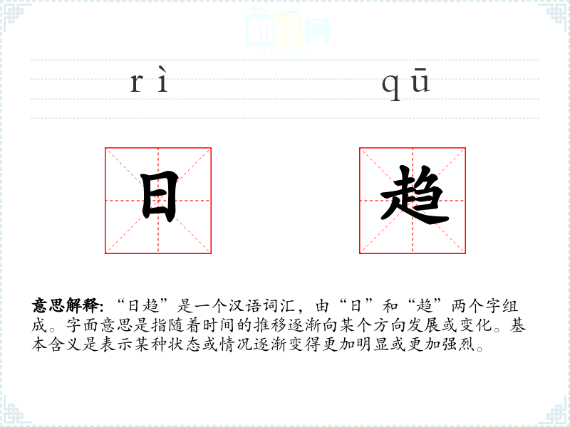 “日趋”是一个汉语词汇,由“日”和“趋”两个字组成。字面意思是指随着时间的推移逐渐向某个方向发展或变化。基本含义是表示某种状态或情况逐渐变得更加明显或更加强烈。