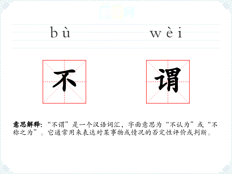 “不谓”是一个汉语词汇,字面意思为“不认为”或“不称之为”。它通常用来表达对某事物或情况的否定性评价或判断。