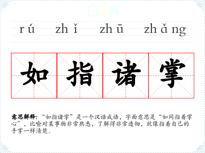 “如指诸掌”是一个汉语成语,字面意思是“如同指着掌心”,比喻对某事物非常熟悉,了解得非常透彻,就像指着自己的手掌一样清楚。