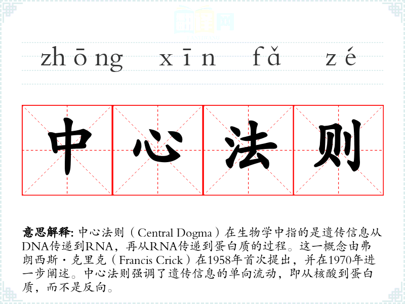 “中心法则”一词由弗朗西斯·克里克创造,源自拉丁语“dogma”,意为“教条”或“原则”。随着分子生物学的发展,中心法则的内容和解释也在不断完善和修正。