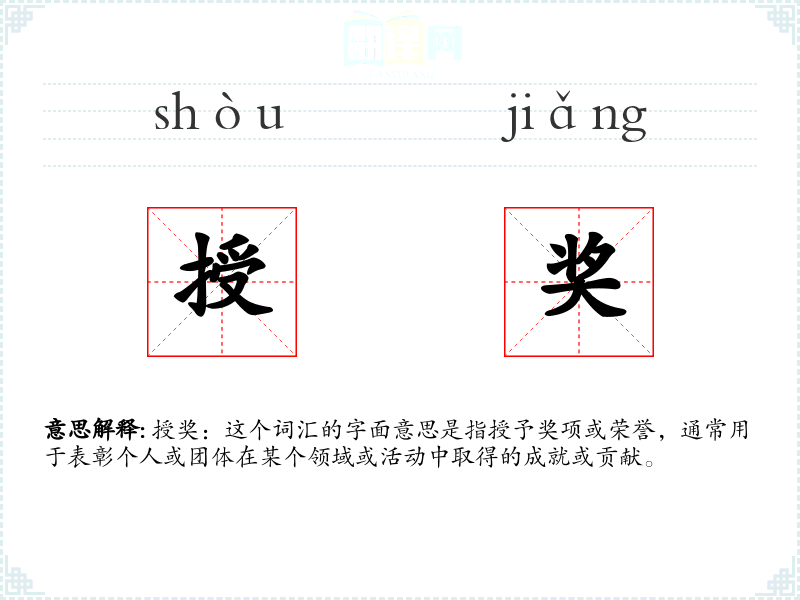 授奖:这个词汇的字面意思是指授予奖项或荣誉,通常用于表彰个人或团体在某个领域或活动中取得的成就或贡献。