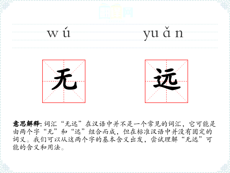 词汇“无远”在汉语中并不是一个常见的词汇,它可能是由两个字“无”和“远”组合而成,但在标准汉语中并没有固定的词义。我们可以从这两个字的基本含义出发,尝试理解“无远”可能的含义和用法。