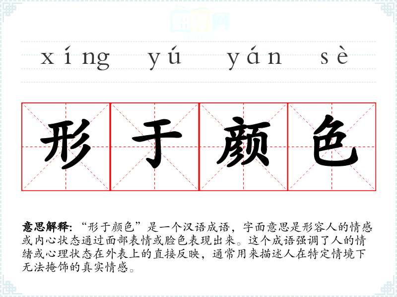 “形于颜色”是一个汉语成语,字面意思是形容人的情感或内心状态通过面部表情或脸色表现出来。这个成语强调了人的情绪或心理状态在外表上的直接反映,通常用来描述人在特定情境下无法掩饰的真实情感。