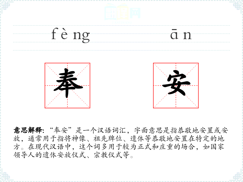 “奉安”是一个汉语词汇,字面意思是指恭敬地安置或安放,通常用于指将神像、祖先牌位、遗体等恭敬地安置在特定的地方。在现代汉语中,这个词多用于较为正式和庄重的场合,如国家领导人的遗体安放仪式、**仪式等。
