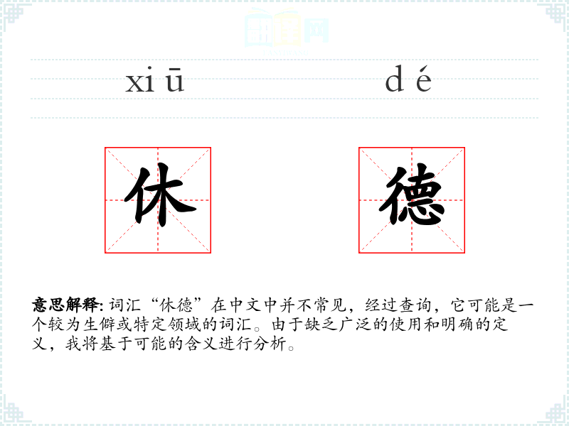 词汇“休德”在中文中并不常见,经过查询,它可能是一个较为生僻或特定领域的词汇。由于缺乏广泛的使用和明确的定义,我将基于可能的含义进行分析。
