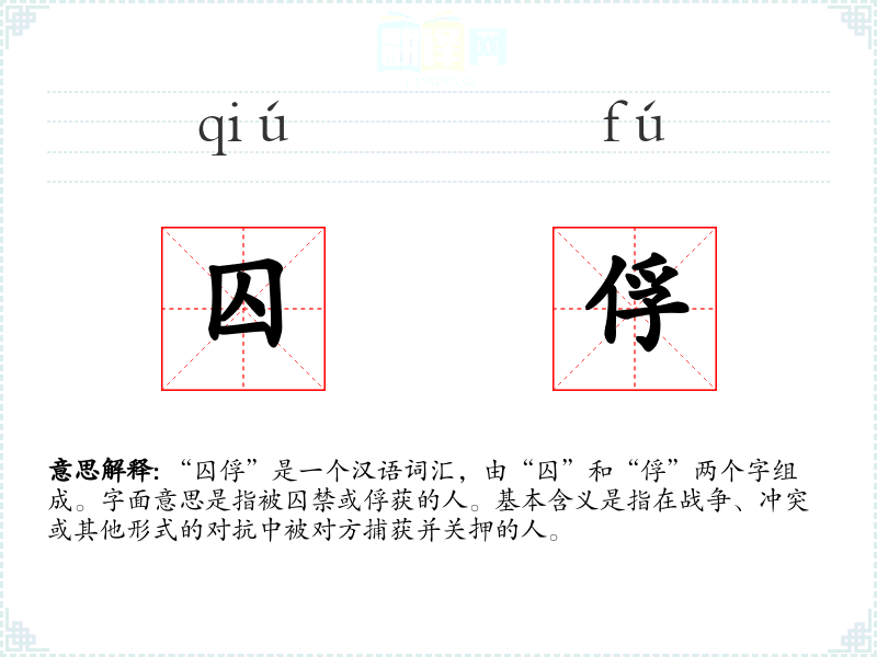 在特定的文化或社会背景中,“囚俘”可能带有特定的历史和情感色彩。例如,在讨论二战期间的战俘时,这个词可能会唤起人们对战争苦难和人类尊严的思考。