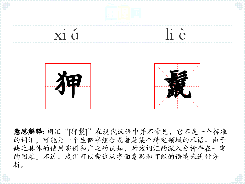 词汇“[狎鬣]”在现代汉语中并不常见,它不是一个标准的词汇,可能是一个生僻字组合或者是某个特定领域的术语。由于缺乏具体的使用实例和广泛的认知,对该词汇的深入分析存在一定的困难。不过,我们可以尝试从字面意思和可能的语境来进行分析。