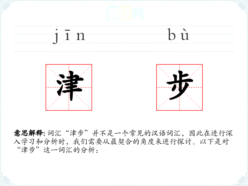 “津步”字面意思可能指的是在渡口或码头的步行动作,其中“津”通常指渡口或码头,“步”则是步行。然而,由于这个词汇并不常见,其基本含义可能需要更多的语境来确定。