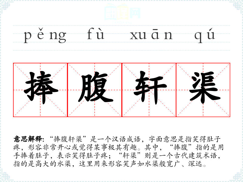 “捧腹轩渠”是一个汉语成语,字面意思是指笑得肚子疼,形容非常开心或觉得某事极其有趣。其中,“捧腹”指的是用手捧着肚子,表示笑得肚子疼;“轩渠”则是一个古代建筑术语,指的是高大的水渠,这里用来形容笑声如水渠般宽广、深远。