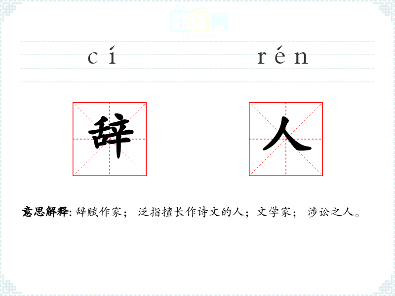 辞赋作家; 泛指擅长作诗文的人;文学家; 涉讼之人。