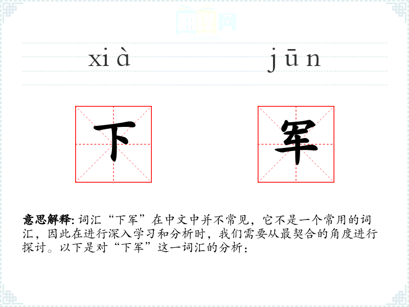 词汇“下军”在中文中并不常见,它不是一个常用的词汇,因此在进行深入学*和分析时,我们需要从最契合的角度进行探讨。以下是对“下军”这一词汇的分析: