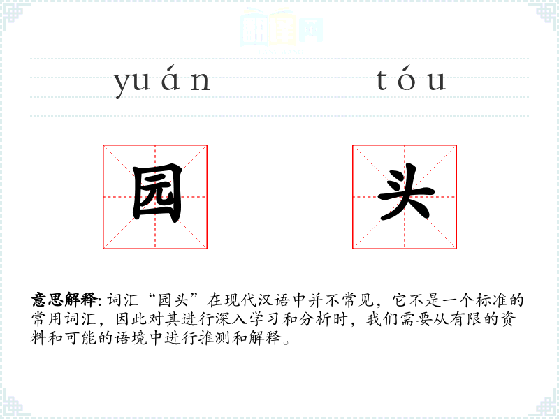 词汇“园头”在现代汉语中并不常见,它不是一个标准的常用词汇,因此对其进行深入学*和分析时,我们需要从有限的资料和可能的语境中进行推测和解释。