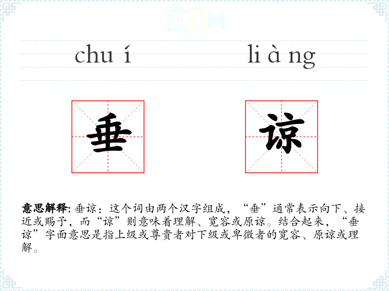 垂谅:这个词由两个汉字组成,“垂”通常表示向下、接近或赐予,而“谅”则意味着理解、宽容或原谅。结合起来,“垂谅”字面意思是指上级或尊贵者对下级或卑微者的宽容、原谅或理解。