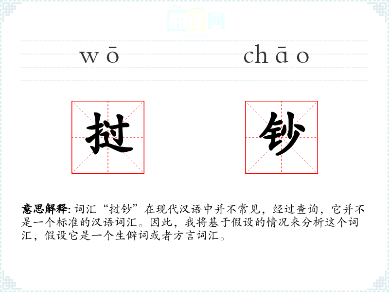 词汇“挝钞”在现代汉语中并不常见,经过查询,它并不是一个标准的汉语词汇。因此,我将基于假设的情况来分析这个词汇,假设它是一个生僻词或者方言词汇。