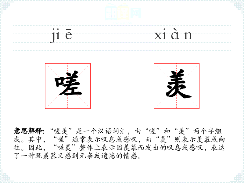 “嗟”字最早见于《说文解字》,原意为叹息。“羡”字则有“超越”之意,后引申为羡慕。两者结合的“嗟羡”在古代文献中已有使用,如《诗经》中就有“嗟我怀人,寘彼周行”的句子,表达了一种对远方的向往和叹息。