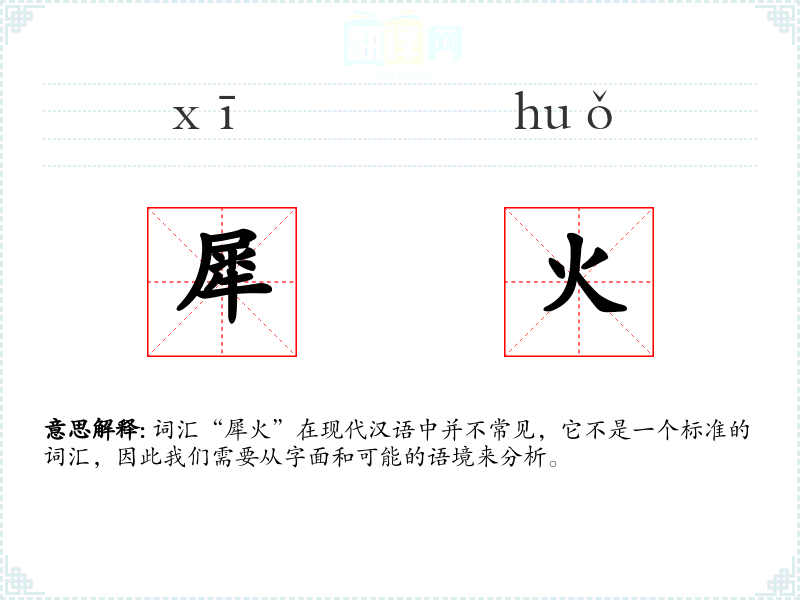 词汇“犀火”在现代汉语中并不常见,它不是一个标准的词汇,因此我们需要从字面和可能的语境来分析。