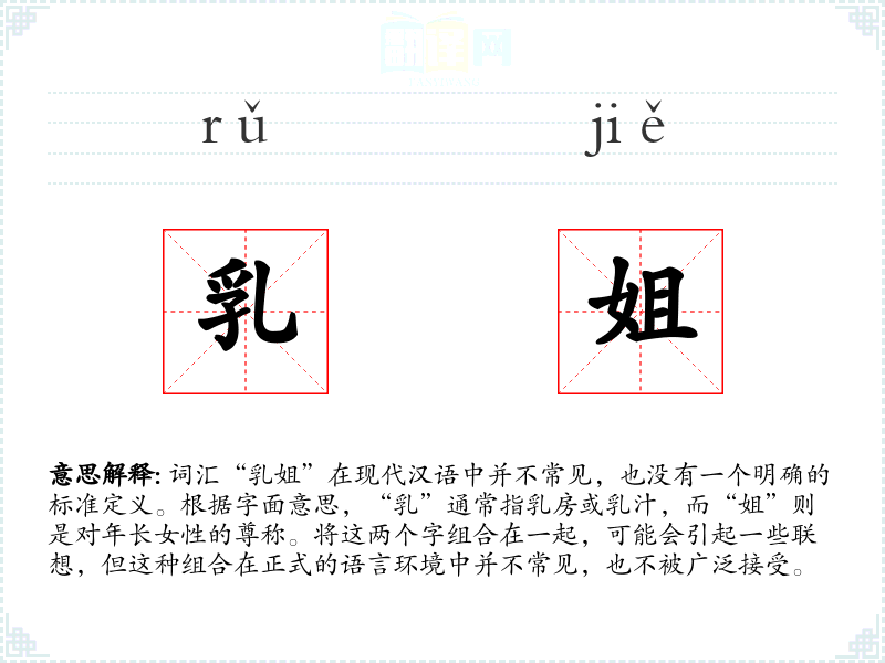 由于“乳姐”不是一个标准的词汇,因此很难给出一个确切的基本定义。它可能被某些人用作非正式的、甚至是带有贬义的称呼,但这并不是普遍接受的用法。